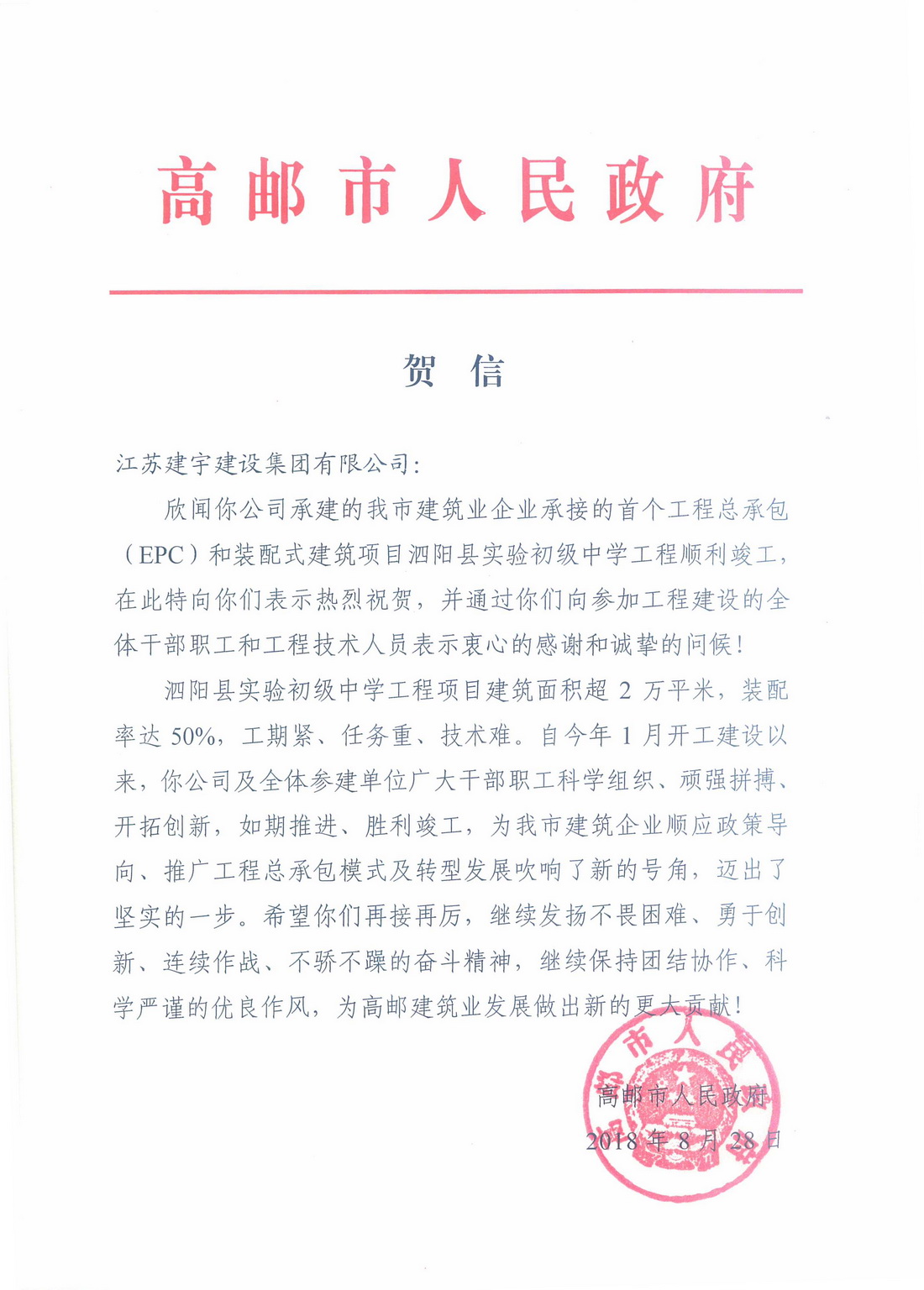 賀信說:欣聞你公司承建的我市建筑業(yè)企業(yè)承接的首個工程總承包(EPC)和裝配式建筑項目泗陽縣實驗初級中學工程順利竣工,在此特向你們表示熱烈祝賀,并通過你們向參加工程建設的全體干部職工和工程技術(shù)人員表示衷心的感謝和誠摯的問候!