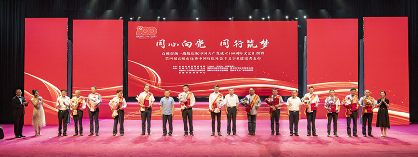 同行筑夢”—高郵市統(tǒng)一戰(zhàn)線慶祝中國共產(chǎn)黨成立100周年文藝匯演暨第四屆高郵市中國特色社會主義事業(yè)建設(shè)者表彰活動在文體中心舉行。揚州市委統(tǒng)戰(zhàn)部副部長、市工商聯(lián)黨組書記陳榮進,市委統(tǒng)戰(zhàn)部副部長、市民宗局局長朱建明,市僑辦副主任李越平,高郵市委副書記鄭志明,市委常委、統(tǒng)戰(zhàn)部部長、宣傳部部長楊文喜,市人大副主任楊向東,副市長王薇等市四套班子領(lǐng)導觀看演出。集團董事長管民良作為受表彰人員應(yīng)邀出席。