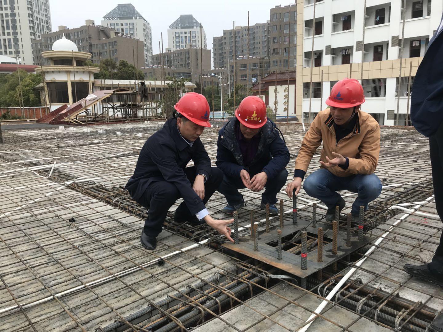 在深入察看了施工現(xiàn)場后,董事長管民良認真聽取了項目負責人與相關(guān)現(xiàn)場管理人員的情況介紹,并深入每一棟樓的施工場地,詳細詢問了現(xiàn)場的質(zhì)量、安全、進度情況,在主體一層仔細察看了預(yù)制梁排架支撐的搭設(shè),柱、梁、板的節(jié)點支模情況,指示要嚴格按照裝配式建筑施工規(guī)范施工。隨后登上吊裝工作層,詳細了解了裝配式建筑施工重要吊裝工序,和宿遷分公司經(jīng)理湯真標,現(xiàn)場項目部經(jīng)理周軍共同探討了預(yù)制柱的下部灌漿技術(shù)和上部錨接技術(shù),要求一定要抓好灌漿和錨接這兩個關(guān)鍵工序。同時針對工地現(xiàn)場布置存在的問題提出了要求,必須達到省文明工地標準,迎接各級領(lǐng)導檢查觀摩。