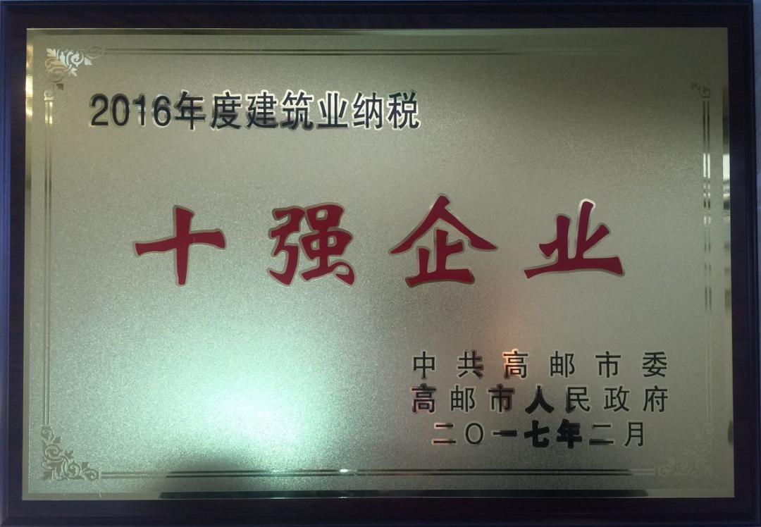 2017年2月6日,從高郵市政府舉行的高郵市建筑業(yè)發(fā)展大會(huì)上傳來(lái)喜訊:我集團(tuán)被授予“高郵市建筑業(yè)納稅十強(qiáng)企業(yè)”榮譽(yù)稱(chēng)號(hào)。