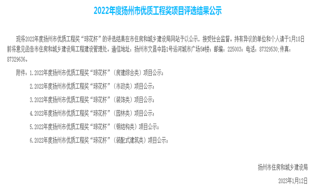 揚州市“瓊花杯”優(yōu)質工程獎是揚州市建設工程質量最高榮譽獎,代表著全市范圍內各建筑施工企業(yè)質量管理的領先水平,評審標準高,數(shù)量控制嚴。申報省“瓊花杯”優(yōu)質工程獎,必須具備市優(yōu)質結構、市級標化工地、工程建設QC成果等多項要求。