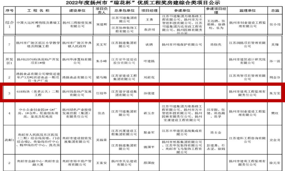 日前,2022年度揚州市優(yōu)質工程獎項揭曉,集團揚州分公司承建的“618(美景云天)二期工程”項目,被揚州市住房和城鄉(xiāng)建設局表彰為揚州市“瓊花杯”優(yōu)質工程獎。此前,揚州分公司天賦星辰和錦麟世紀項目還分別獲得省標化星級工地,多個項目榮獲市標化工地、新技術應用示范工程。
