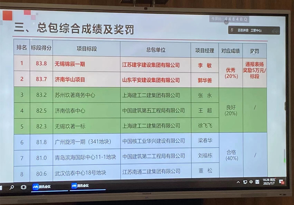 錦辰項目在中信泰富地產(chǎn)全國評比,多次取得較好成績,受到了主管部門、甲方、第三方咨詢機構(gòu)的好評。本次2023年第二輪工程評估中榮獲第一名的好成績,并獲獎勵5萬元,又一次證明集團綜合實力和項目管理能力。