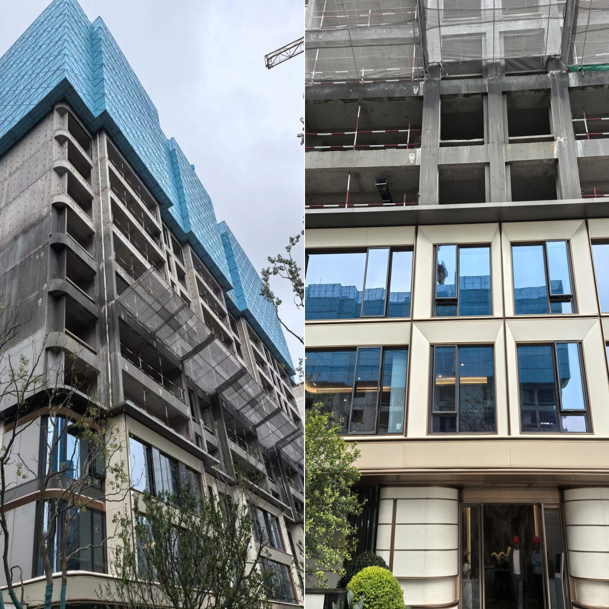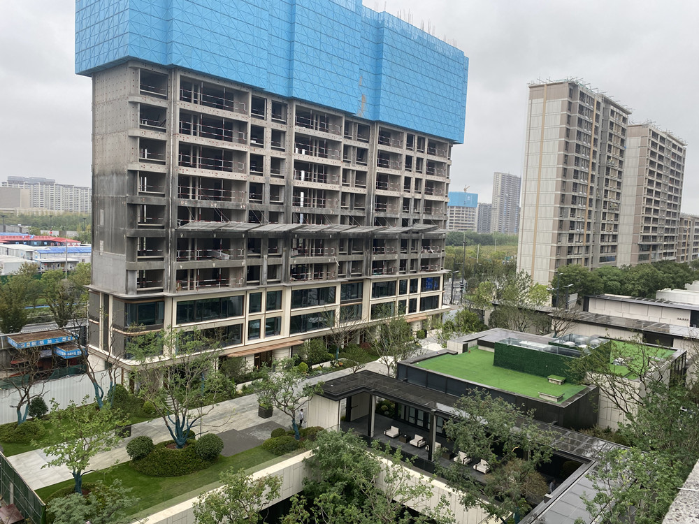 目前,項目是外裝飾、二次結構、主體結構的三階段同步施工,項目部按業(yè)主要求,與分包單位精心謀劃、組織實施。同時,為保證樣板展區(qū)訪客安全,項目部還創(chuàng)新采用了后掛式挑網等安全措施,進一步提升了施工現場的安全保障水平。從外立面看,項目層次分明,立體感強,展現出獨特的建筑美感。