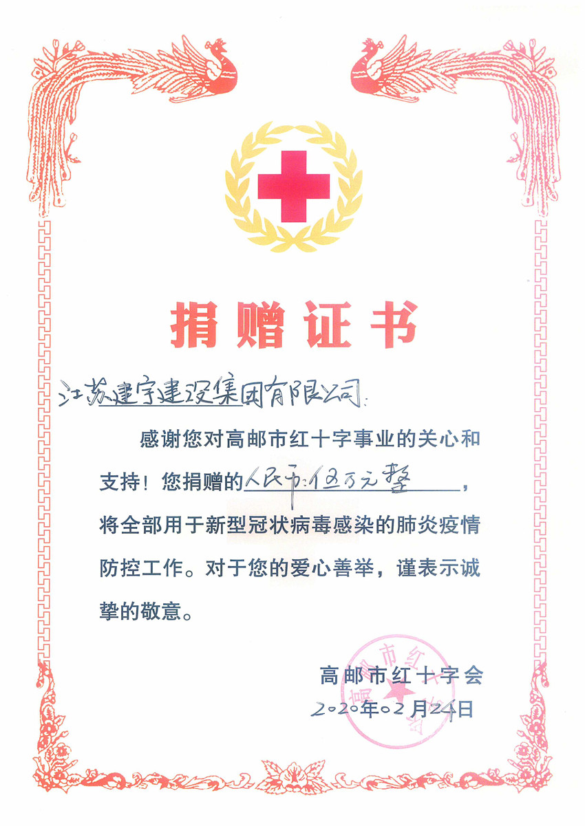 捐贈(zèng)儀式上,集團(tuán)董事長管民良表示,新冠肺炎疫情牽動(dòng)著國人的心,建宇集團(tuán)積極參與抗疫,集團(tuán)旗下皇華大酒店堅(jiān)守多日,為市防疫指揮部提供優(yōu)服務(wù);集團(tuán)此前已通過南京市高郵商會(huì)等多途徑奉獻(xiàn)愛心,此次再捐贈(zèng)5萬元用于抗擊新冠肺炎疫情。周鎮(zhèn)長等領(lǐng)導(dǎo)對集團(tuán)的善行義舉和愛心捐贈(zèng)表示真誠的感謝,并現(xiàn)場頒發(fā)愛心證書,稱贊集團(tuán)此舉是作為市、鎮(zhèn)重點(diǎn)建筑企業(yè)勇于承擔(dān)社會(huì)責(zé)任的體現(xiàn)。